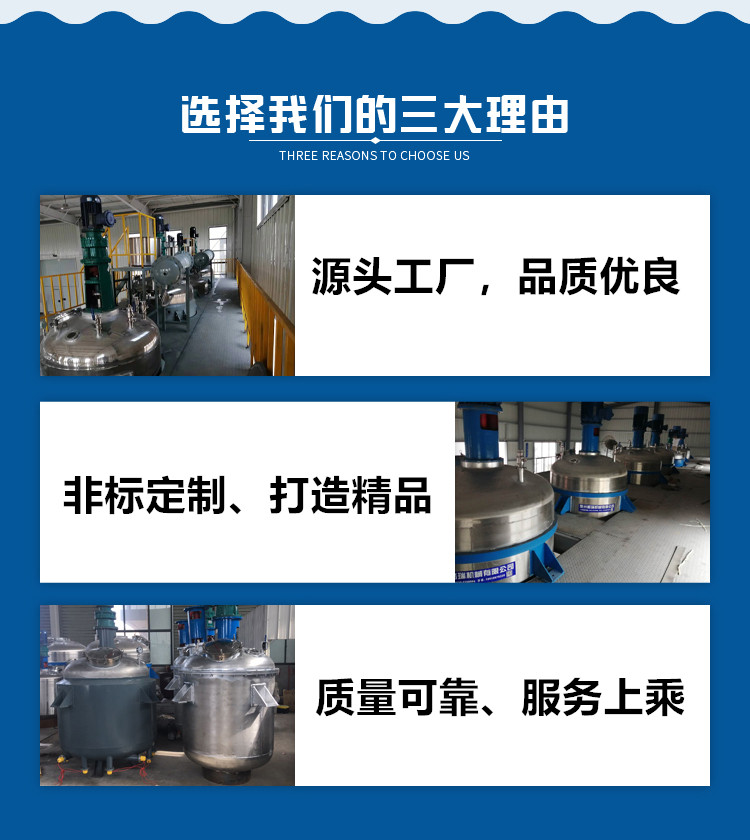 公司专业生产50-5000L系列不锈钢反应釜、电加热反应釜、汽加热反应釜、高压反应釜、盘管式反应釜、不饱和聚酯树脂反应釜等设备。反应釜结构由锅体、锅盖、搅拌器、夹套、支承及传动装置、轴封装置等组成,工艺先进、结构合理、经久耐用,并具有耐高温、耐腐蚀、使用方便等特点,目前已广泛应用于石油、化工、橡胶、农药、染料、医药、食品、科研等行业,用来完成硫化、硝化、氢化、烃化、聚合、缩合等工艺过程,以及有机染料和中间体等其他许多工艺过程的反应设备。