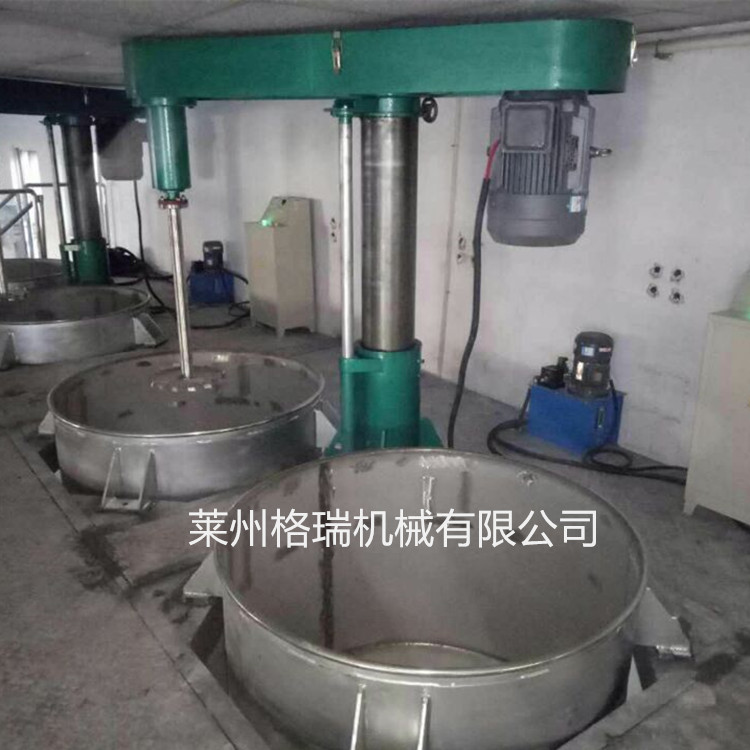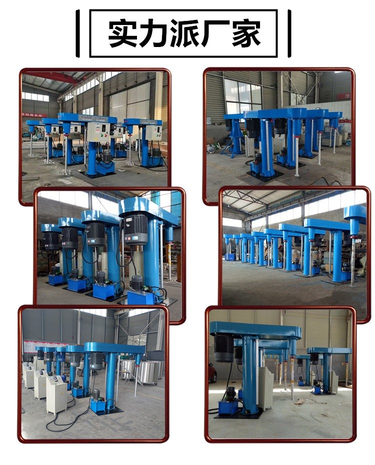 架台式的高速分散机的主体结构,基本上和标准高速分散机的架构相同,是配合搅拌桶的尺寸高度,将标准高速分散机固定位置于搅拌机的半腰上,可将固定在架台上,方便由架台上面放置原料入搅拌槽,由伸到架台下面的搅拌桶出料口将搅拌好的原料成品排放出搅拌桶,直接包装或者下一个程序。