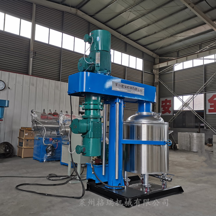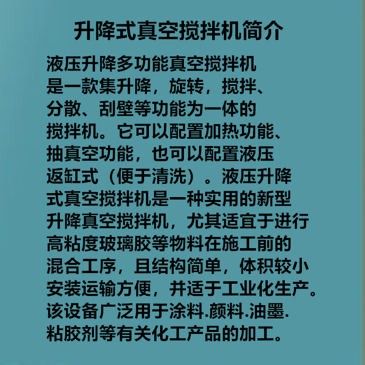 升降式真空搅拌机可以升降,旋转,搅拌分散刮壁,抽真空,也可以配置电加热。升降式真空搅拌机由电动机全速运转带动主轴,经主轴转动搅拌框内之四氟搅拌片,使其将桶槽内之液体经框槽上、下两侧之导流叶片吸入环状框槽内,经以主轴为中心高速旋转叶片;连续使四氟搅拌片与筒体间小之间系高频率之强力切割剪断、粉碎,再借叶片高速离心旋转,持续循环混合,以短之时间即可完成搅拌,分散,刮壁,刮边之作用。升降式真空搅拌机配置两个主电机,一个高速一个慢速。高速电机作用搅拌分散作用,慢速电机刮壁,刮边作用。本搅拌机刮壁式搅拌装置,增进产品的生产速度,一边搅拌一边刮壁,搅拌物料无死角。升降式真空搅拌机 适用于化工,医药及食品,调理食品(酱料类)、制药(膏霜类)、日化(膏霜类)、胶粘剂,涂料等黏度(或)浓度较高的物料的预煮、配(炒)制,搅拌,浓缩。并可按工艺需要配备真空系统。