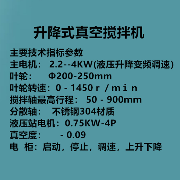 液压出料机配真空搅拌机,升降式真空搅拌机配置两个主电机,一个高速一个慢速。高速电机作用搅拌分散作用,慢速电机刮壁,刮边作用。本搅拌机刮壁式搅拌装置,增进产品的生产速度,一边搅拌一边刮壁,搅拌物料无死角。升降式真空搅拌机 适用于化工,医药及食品,调理食品(酱料类)、制药(膏霜类)、日化(膏霜类)、胶粘剂,涂料等黏度(或)浓度较高的物料的预煮、配(炒)制,搅拌,浓缩。并可按工艺需要配备真空系统。